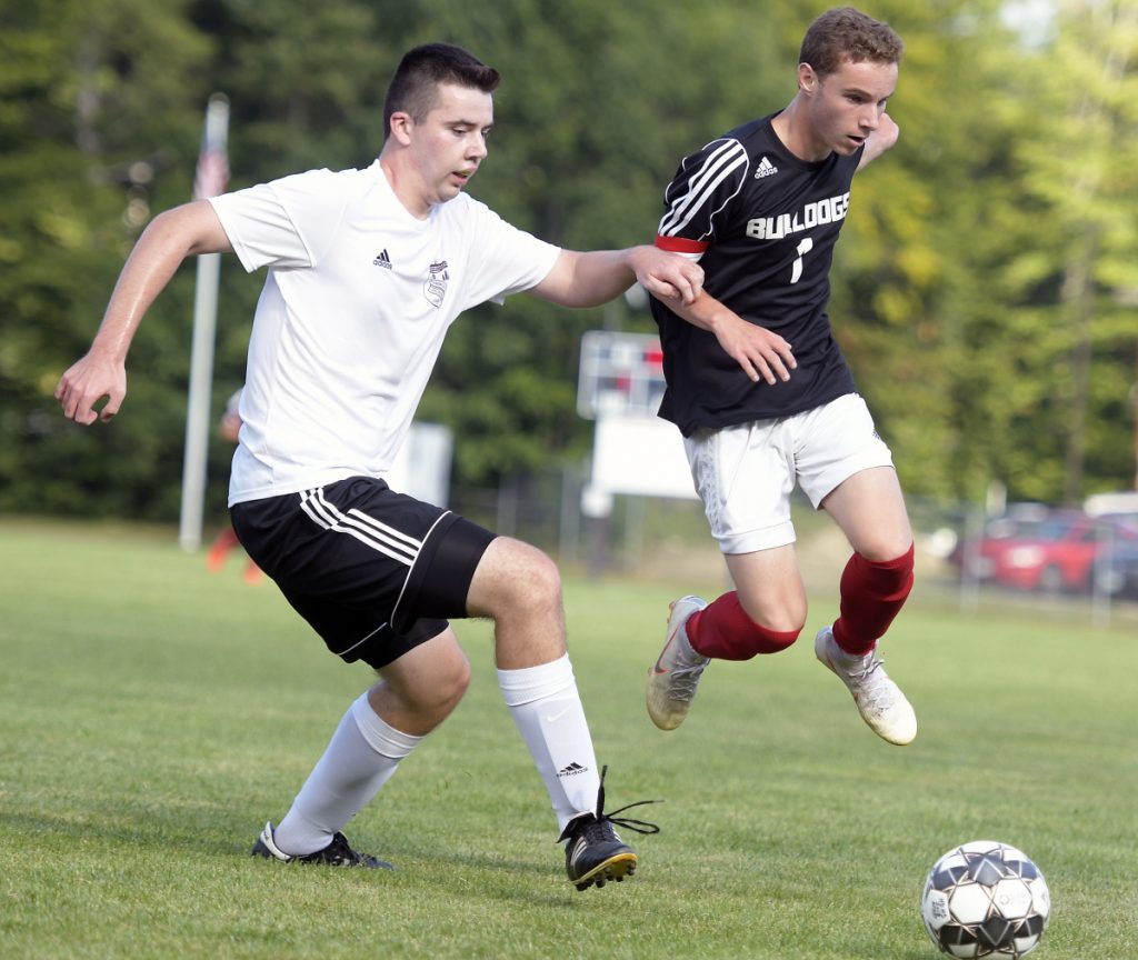 Hall-Dale senior Alec Byron, right, heads the ball past Monmouth Jacob Godbout during a Mountain Valley Conference game Wednesday in Farmingdale.