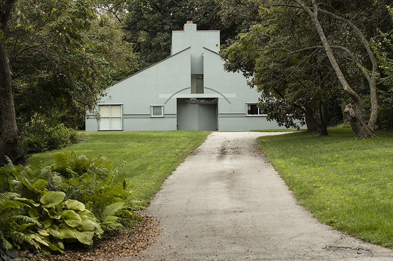 The building’s broken classical pediment that splits the gabled roof and its over-scaled moldings on each side of the symmetrically positioned doorway represented a major break from the established architectural thinking of the time: that a modern house should contain no historical elements.