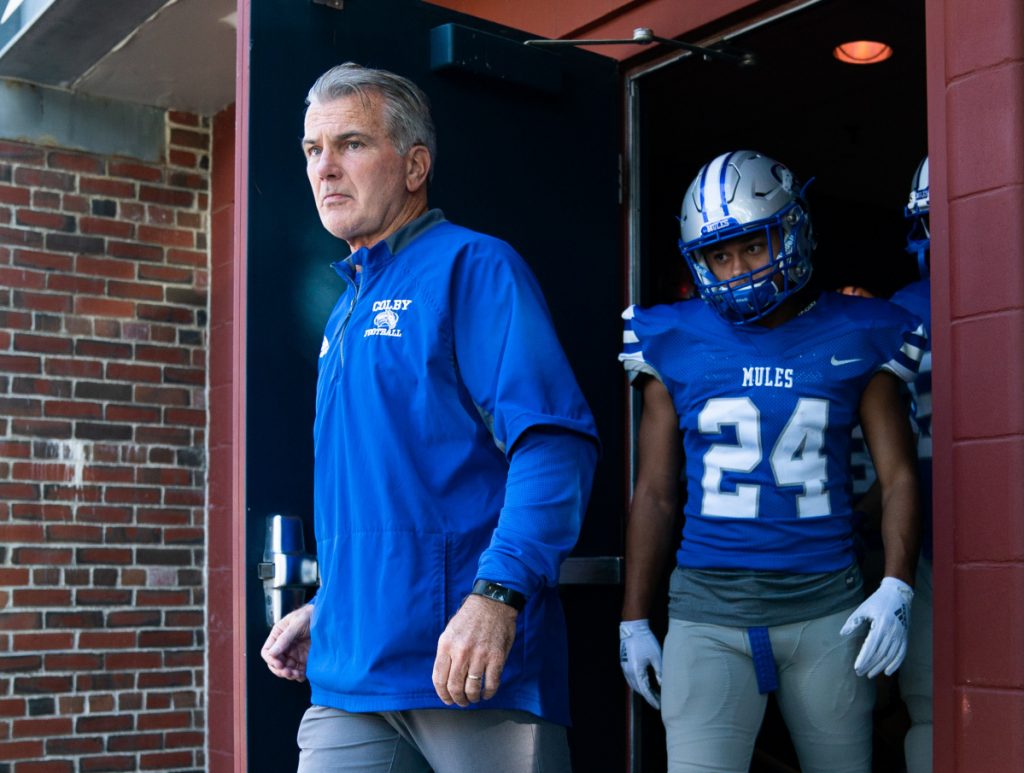 Colby head coach Jack Cosgrove and receiver Jordan Roddy, a Cony graduate, walk toward the field during a game against Wesleyan on Saturday in Waterville.