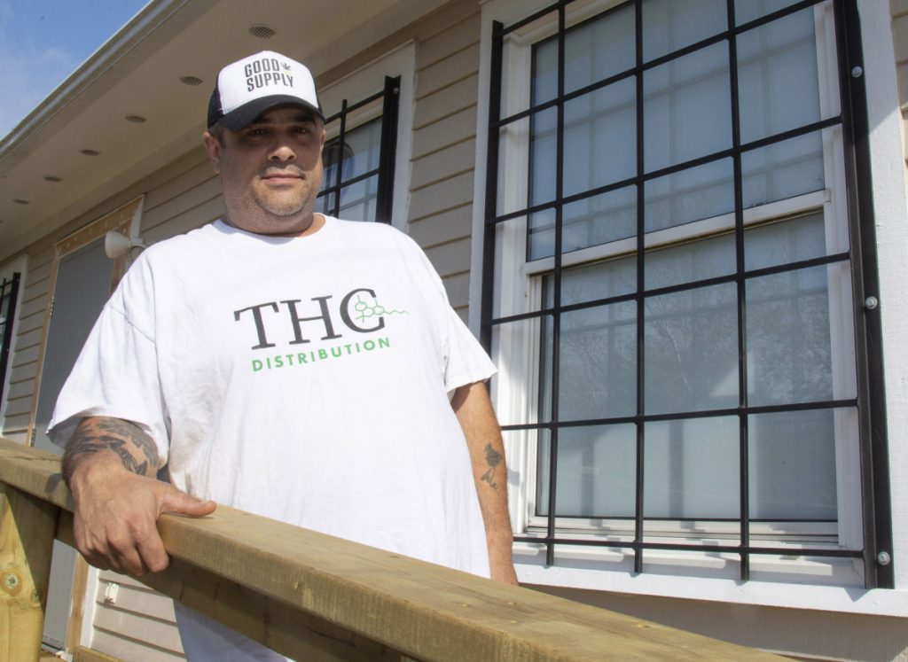 Tom Clarke, left, stands outside his store, THC Distribution, in Portugal Cove-St. Philip’s, Newfoundland-Labrador on Oct. 4. “I am living my dream,” said Clarke, who has been dealing pot illegally for 30 years.