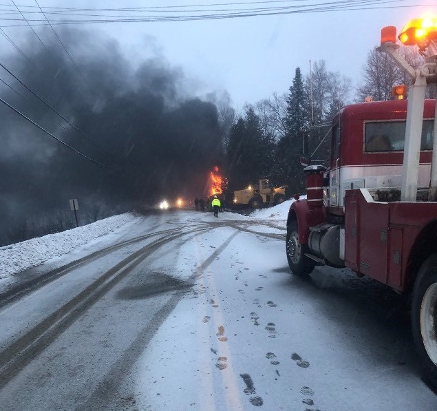 In Aroostook County, Route 1 in Frenchville was shut down Tuesday afternoon after a tractor-trailer rolled over and burst into flames. The driver, Gary Vaillancourt, was operating a 2014 Freightliner filled with potatoes when he lost control on the icy road. There were no reports of injuries, state police said.