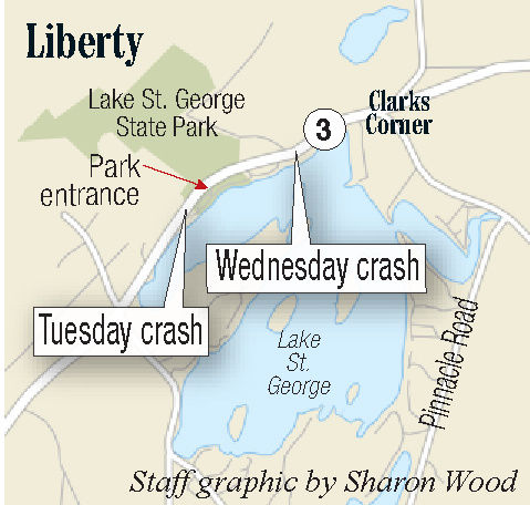 The site of Wednesday’s crash was a quarter-mile from the site of a fatal crash that happened around 9:30 a.m. Tuesday. State police said William Chadwick, 55, of Oakland, was killed when his pickup was struck head-on by a box truck driven by Dusan Dokic, 20, of Spanaway, Washington.