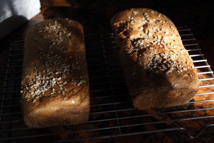 Transfer the loaves to the oven, and bake five minutes at 400 F. Then reduce the temperature to 350 F and continue baking until the crust is a dark brown and the bread reaches an internal temperature of 200 F, about 45 minutes. Remove from the oven and allow the loaves to cool in their pans for five minutes, then turn out onto a wire rack, allowing the bread to cool completely before slicing.