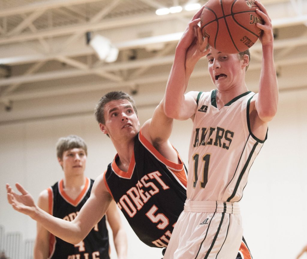 Rangeley’s Nolan Boone (11) battles for the rebound with Forest Hills’ Brandon Gilboe during a game last month in Augusta.
