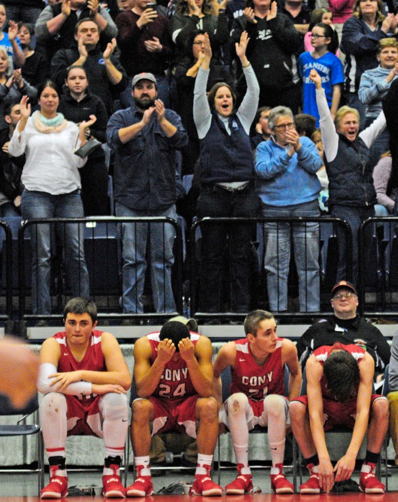 The Cony boys do their “lights out” ritual, a practice coach T.J. Maines brought over from his days playing for his father, Tom, at Morse High School in Bath. Rogers said Maranacook goes the opposite direction.