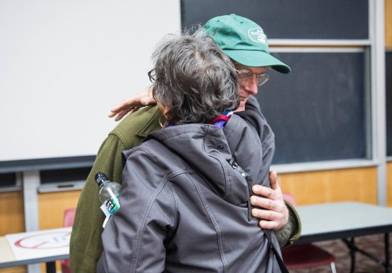 In November, during a panel at the University of Maine-Farmington attended by about 75 people, Hanson met and shared a hug with Roberta Benefiel-Frampton, a protester from Labrador, Canada, who, along with other members of her group, Grand River Keepers of Labrador, was activated by the flooding of Muskrat Falls on the Churchill River. The Maine and Labrador factions have found mutual concern with the expansion of hydropower facilities and power corridors impacting their lands, animals and natural resources.