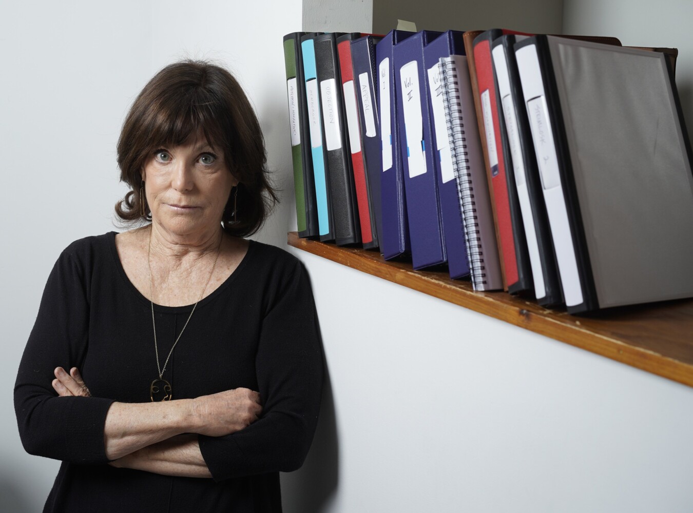 Attorney Beth Maloney, in her Kennebunkport home office, with binders containing documents used to defend Cassie Steimlosk against accusations of medical child abuse. Gregory Rec/Staff Photographer