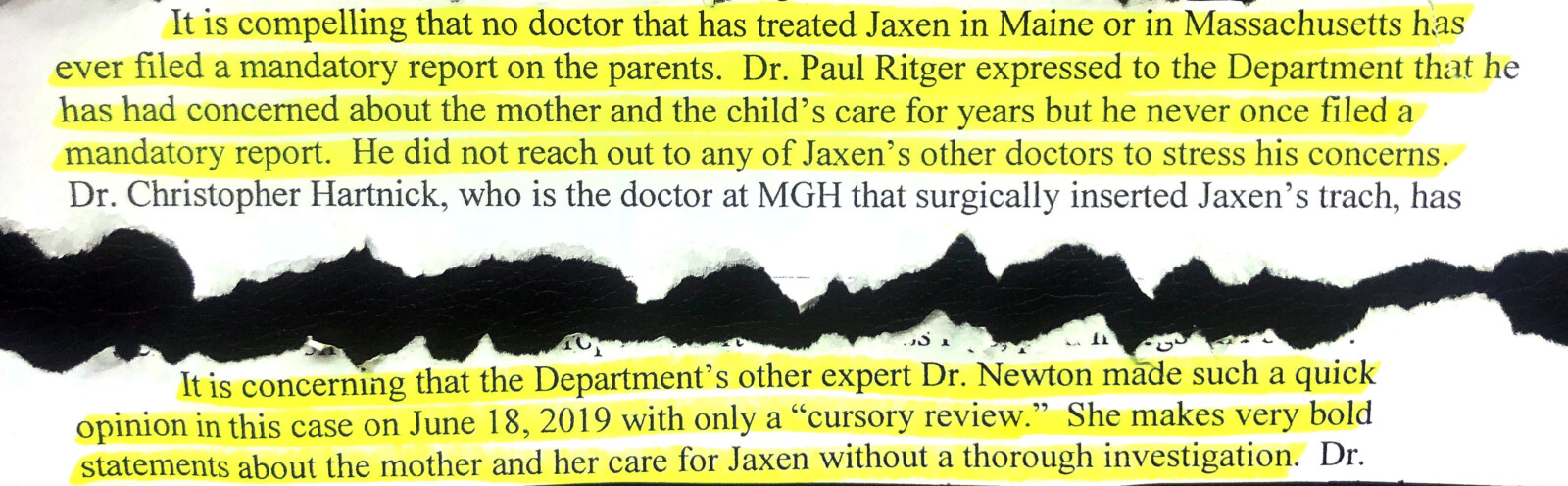 Dr. Eli Newberger, a Boston pediatrician who is a leading expert on medical child abuse, reviewed Jaxen’s case and wrote in a report that the family was “grievously harmed” by Maine’s investigation.