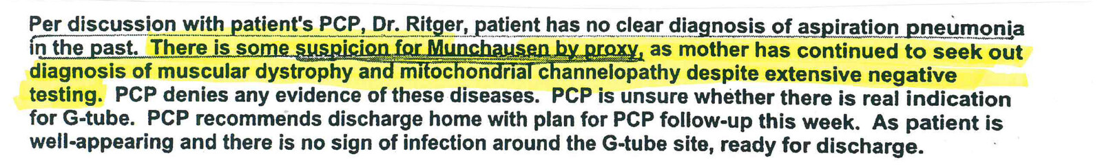 Excerpt from a medical record documenting a September 19, 2018, emergency room visit showing that Jaxen Steimlosk’s pediatrician told doctors he suspected Jaxen’s mother of Munchausen by proxy, or medical child abuse.