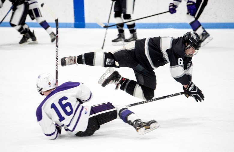 Hampden exploded for four goals in the third period to blow open a close game, including two scores in the first 2:49 of the frame. Noah Dancoes’ goal just 21 seconds after the puck dropped made it a 5-2 lead for the Broncos.