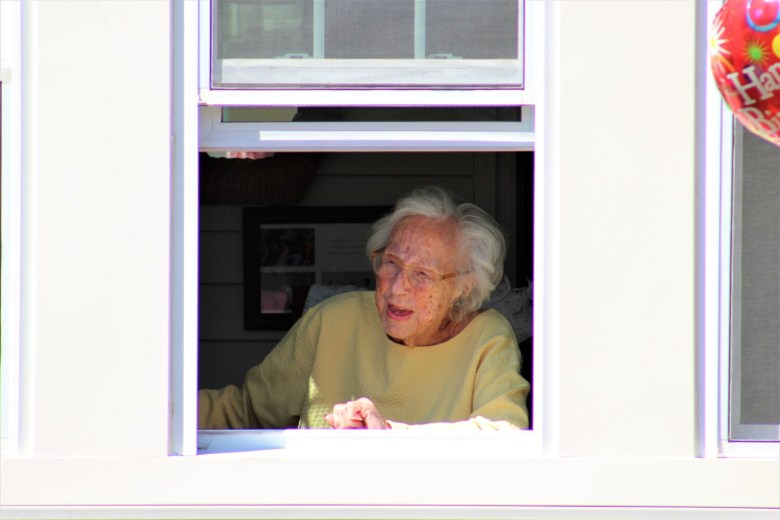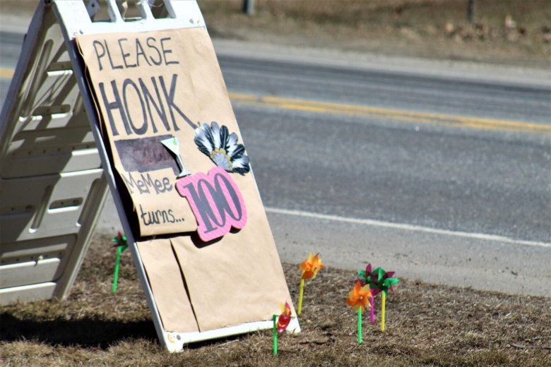 Family scrambled to find a different way to celebrate. They placed 100 pinwheels in her yard and put up signs asking people to honk as they drove by. Family members brought signs and stopped for a chat from the window.