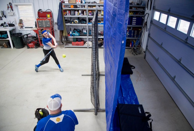There’s a similar setup at Brooke McKenney’s home in Madison, where the sophomore first baseman and pitcher has a heated attachment to the house with a treadmill, elliptical and weights area, and a garage where she and her father can work on her pitching.