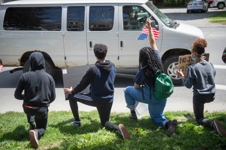 Several demonstrators also gathered at about 6 p.m. Monday outside the Waterville Police Department on Colby Street, where they kneeled for nine minutes to commemorate George Floyd, who died last Monday while in police custody in Minneapolis. The peaceful gathering was made especially poignant when Waterville police Chief Joseph P. Massey kneeled in solidarity with the demonstrators.