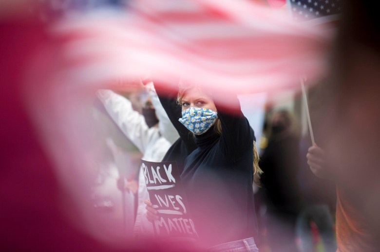 The protest began at noon, with about 100 people lining Silver and Elm streets. Many were wearing face masks and holding signs in support of the Black Lives Matter movement. By 1 p.m., the crowd had grown to more than 200.