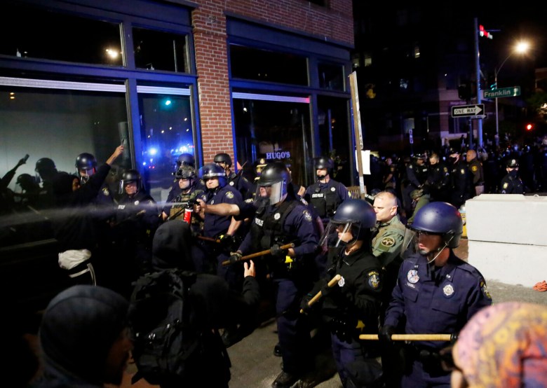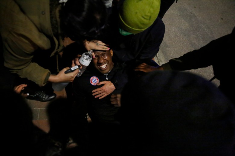 Eventually, within sight of the Capitol building, the marchers were turned back by law enforcement officers using tear gas, pellets and low-flying helicopters kicking up debris. As they dispersed, some protesters smashed windows at a nearby office building.