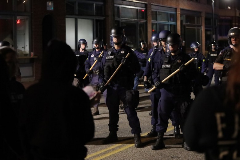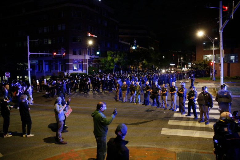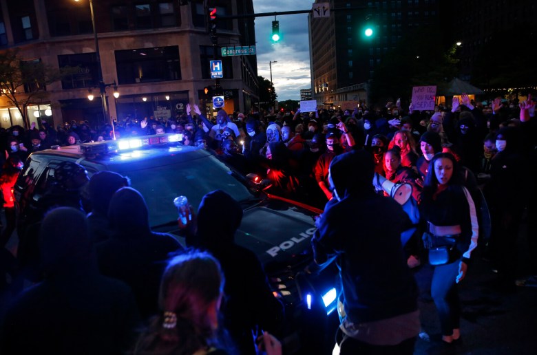 On Monday, demonstrations erupted from Philadelphia, where hundreds of protesters spilled onto a highway in the heart of the city, to Atlanta, where police fired tear gas at demonstrators, to Nashville, where more than 60 National Guard soldiers put down their riot shields at the request of peaceful protesters who had gathered in front of Tennessee’s state Capitol to honor Floyd. Two people were killed during protests in the Chicago suburb of Cicero, authorities said, but provided no details. In Louisville, Kentucky, riot police firing tear gas scattered several hundred protesters from downtown, violently capping a day of mostly peaceful protests.