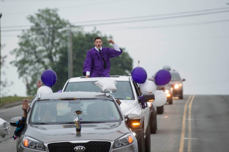 Earlier, they had lined up a few miles away, at the high school parking lot off Brooklyn Avenue. They sat inside vehicles, flanked by signs, flowers and purple-and-white balloons — the school colors.