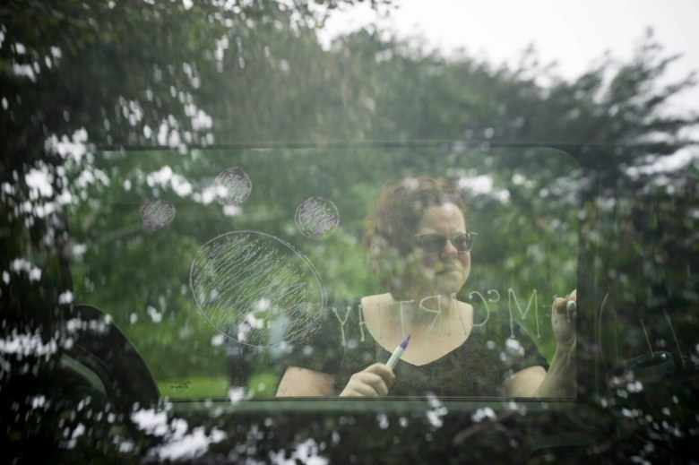 Senior Amaryllis Charles, 18, drove a van whose hood sported a large, handcrafted graduation cap with flowers made by her mother, Katie Tredeau.