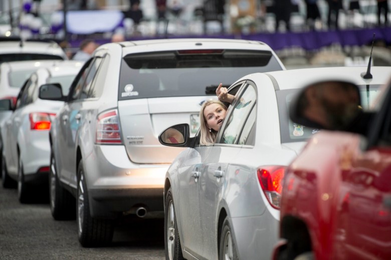 Before leaving the high school parking lot prior to graduation, seniors sat inside vehicles with their families, lining up for the parade of cars.