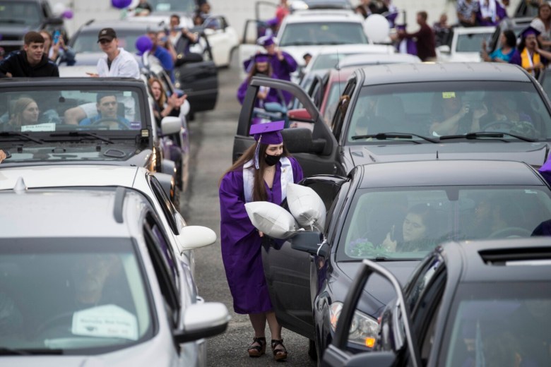 Everyone had to remain inside their vehicles because of the coronavirus pandemic. Students wearing caps, gowns and masks were called onto the stage in groups of 10 to receive their diplomas.