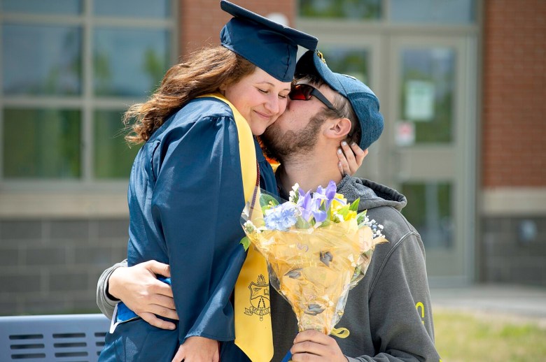 Each student was allowed to remove his or her mask for a brief photo opportunity as he or she, holding a diploma, stood next to Poulin. They were then directed to a grassy area that had been marked for social distancing, where the students cheered for the rest of their group’s graduates.