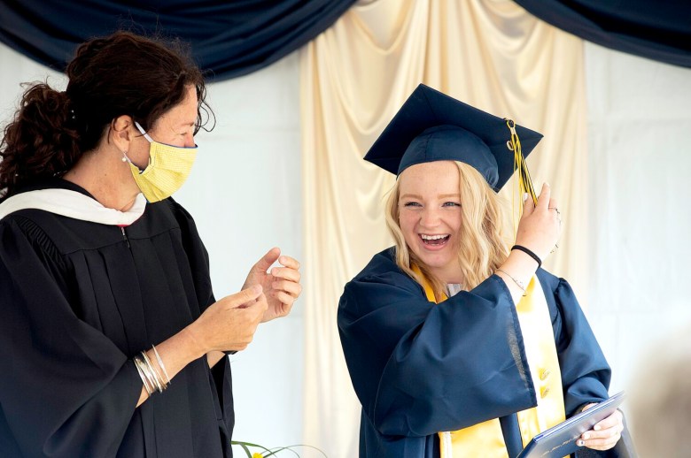 Beneath a white tent, class officers and school staff wearing blue-and-gold masks guided students out of their vehicles. Graduates were then led to a podium to receive their diplomas from Monique Poulin, the school’s principal.