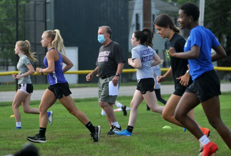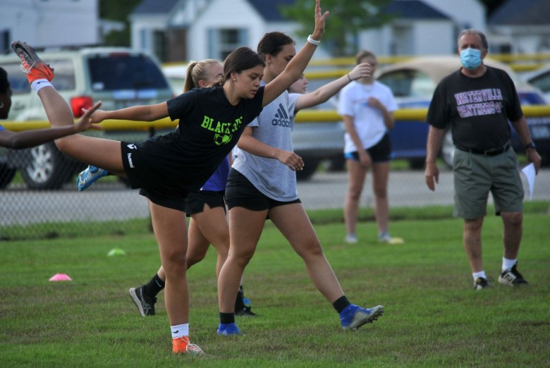 The Waterville girls soccer team got to work early with a morning session. Well-spaced throughout the outfield of Gaul Field, players sprinted, crawled and mountain-climbed under the watchful eye of head coach Mark Serdjenian, who, along with his coaching staff, wore masks throughout the workout.