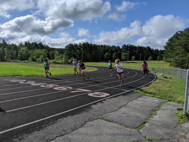 At Cony, enough athletes opted to join the voluntary workouts that the school had to hold morning and afternoon sessions. Athletes from different sports worked out together in four pods on each corner of the Alumni Field track, rather than there being separate groups for each sport.