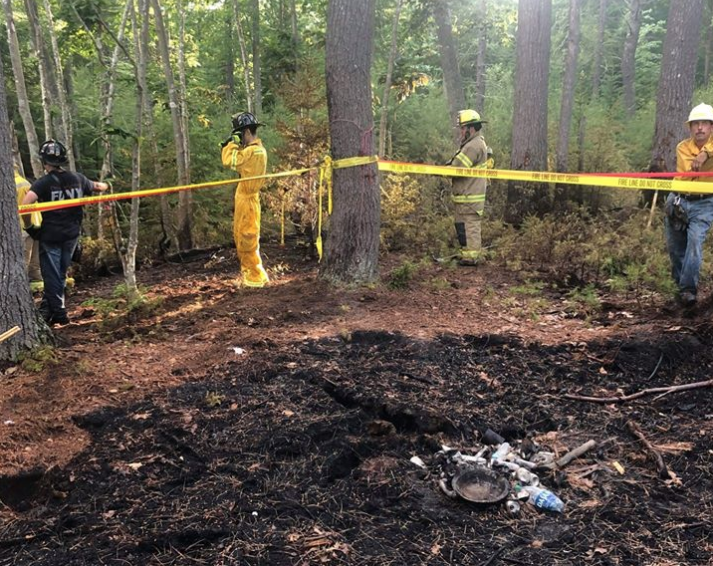 The site of an illegal campsite in Freeport, which sparked a forest fire is taped off after crews extinguished the blaze. Courtesy of the Maine Forest Rangers