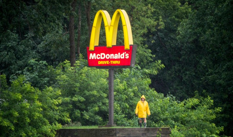 A stream behind McDonald’s restaurant and Cumberland Farms off China Road in Winslow overflowed in Tuesday’s heavy rainstorm, sending water rushing over China Road into a parking lot and causing flooding in some places 3 feet deep.