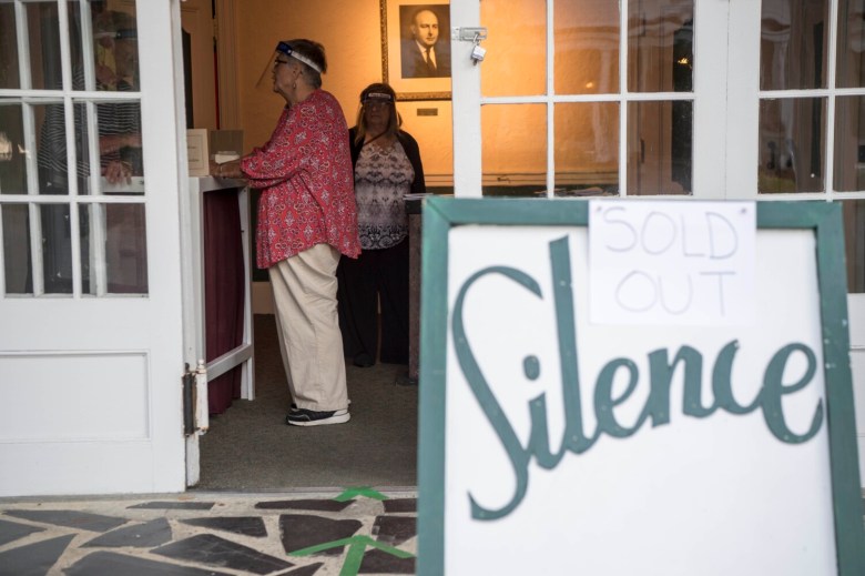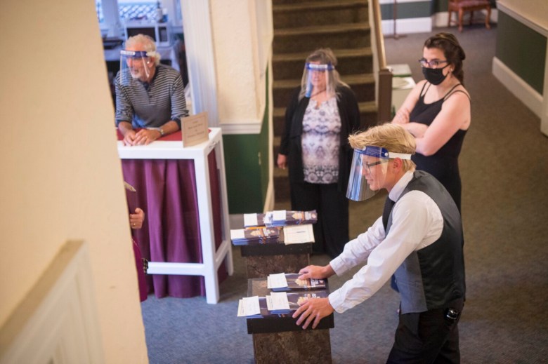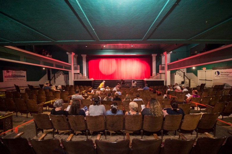 This season, patrons must call the box office at 207-474-7176 to buy tickets, which may not be obtained by ordering online. Ushers wear masks or face shields, the latter allowing their smiles to be seen as they greet patrons, according to Susan Quinn.