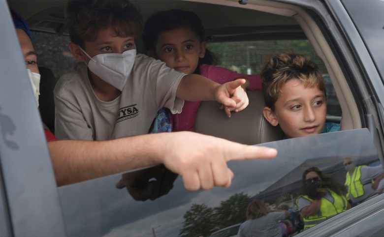 “Yay!” the third-grader said, holding up both her arms, backpack cradled in her lap.