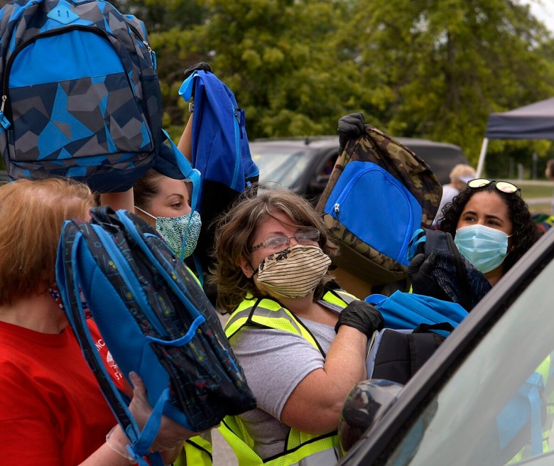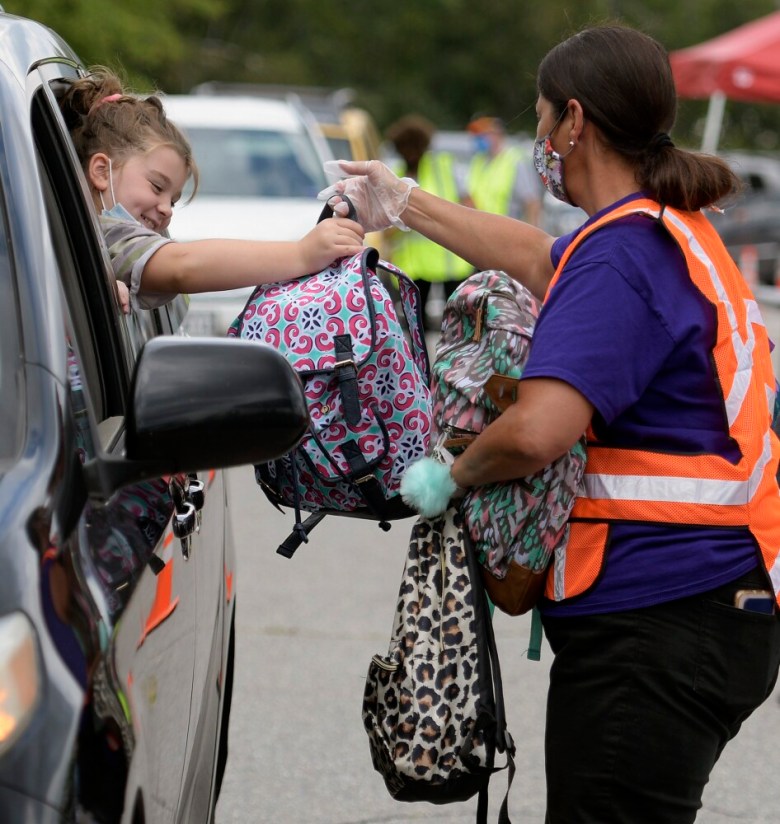 “Kids need that structure and face-to-face teaching,” Douin said between passing out backpacks.