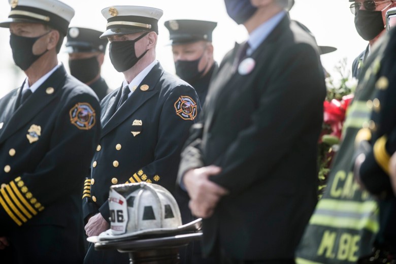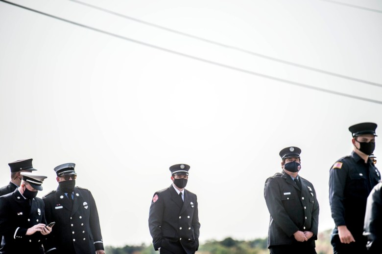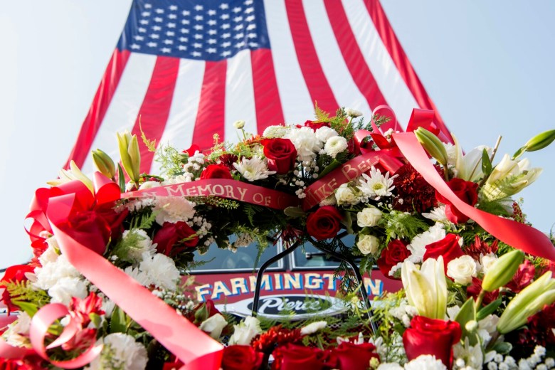 The Tower 3 fire truck served as a backdrop Wednesday, as an over-sized flag snapped in the breeze from its place on a hanger under the aerial truck’s platform. The jacket of Bell’s turnout gear — complete with flashlight sticking out of a pocket — hung on a display stand with his pants and boots on the ground below it. A wreath with evergreens and flowers with a red ribbon and bows was on display in front of the truck.