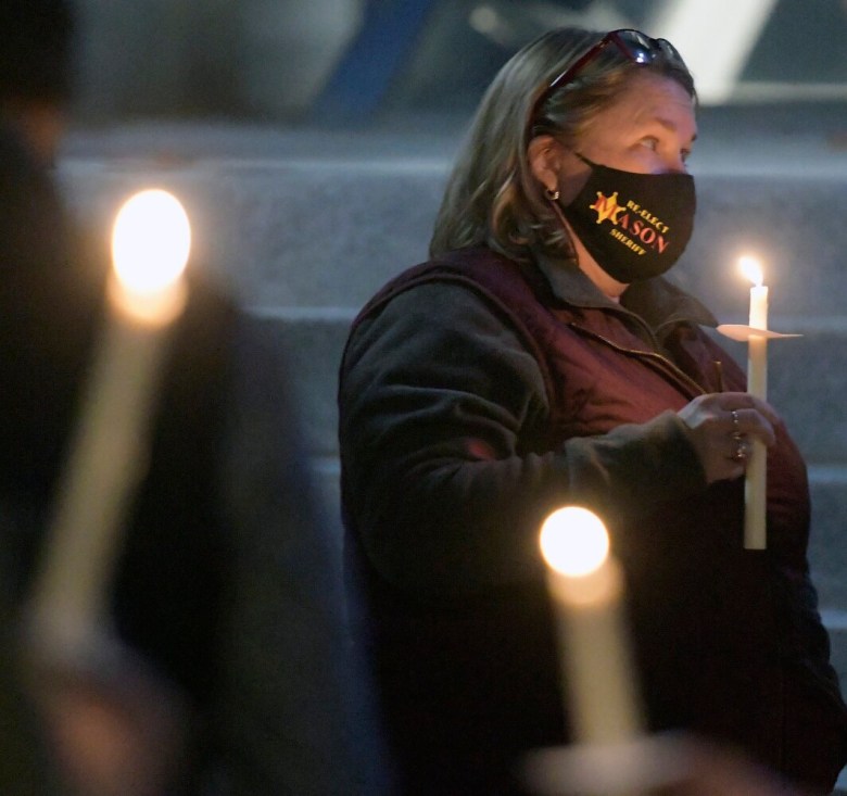 Most participants held candles, illuminating the courtyard steps and platform used as a stage. Masks were worn, with the exception of some of the speakers while making their remarks, and social distancing protocols were followed.