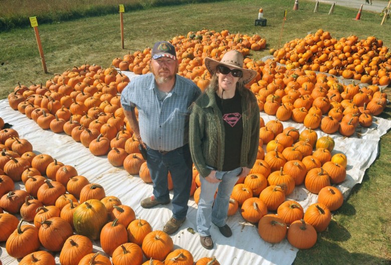 “This is all the pumpkins we have, and that’s half of what we normally get because of the drought and the deer and the woodchucks,” Ring said Sunday, looking over his field of picked pumpkins. “There’s no squash — they ate them all.”