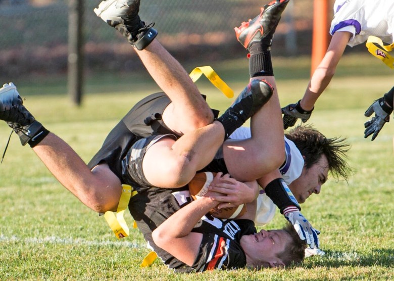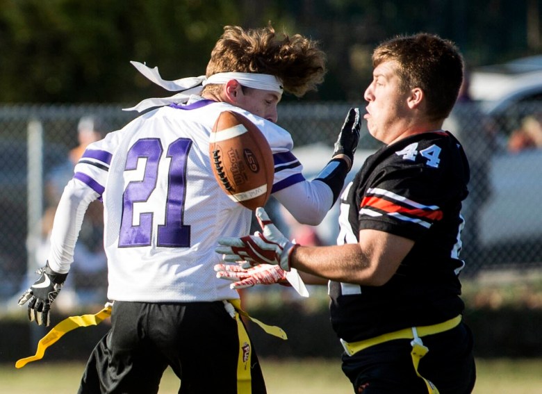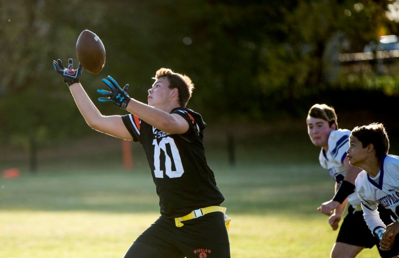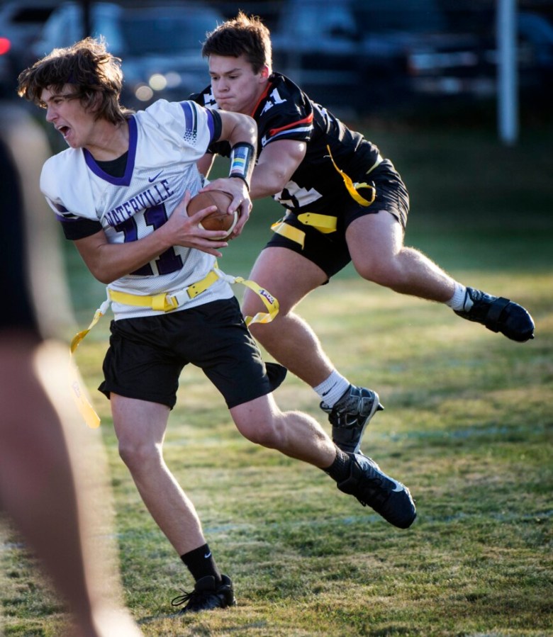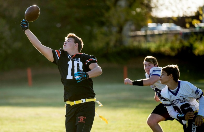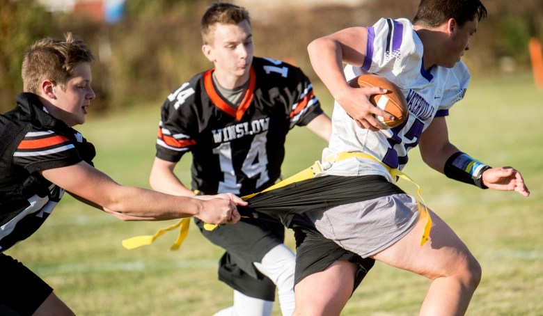 On the other side of the fence, Winslow and Waterville renewed their long rivalry on the field, in 2020 style. Winslow won, 50-36, giving the teams a split of two games in this makeshift season. For state officials, high school tackle football was a non-starter this fall, as Maine fights its battle against the COVID-19 pandemic. Flag football, played 7-on-7, is the Maine Principals’ Association’s tackle football’s replacement.