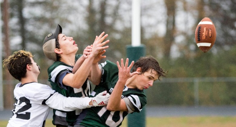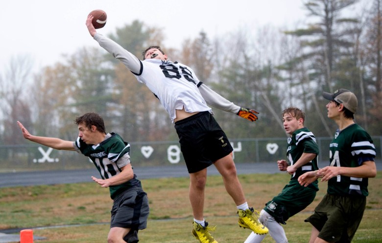 It didn’t matter that the game was two-hand touch, instead of what would have been an eight-man gridiron matchup. The Mustangs had just pulled off a 15-8 victory over Maranacook, which went undefeated in the regular season last year and finished 9-1. The Mustangs had pulled out a victory, and they were going to enjoy it.