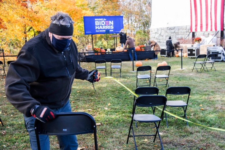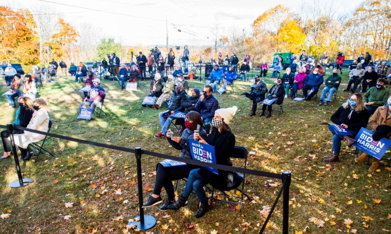Tuesday’s event in Bangor was a stark departure from Trump campaign events. Everyone wore a mask and was distanced, and organizers limited the number of people to about 100 to fall within the guidelines for gatherings set by Gov. Janet Mills.