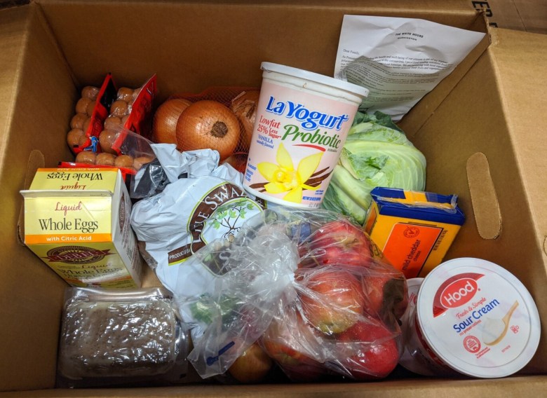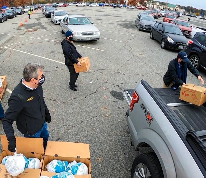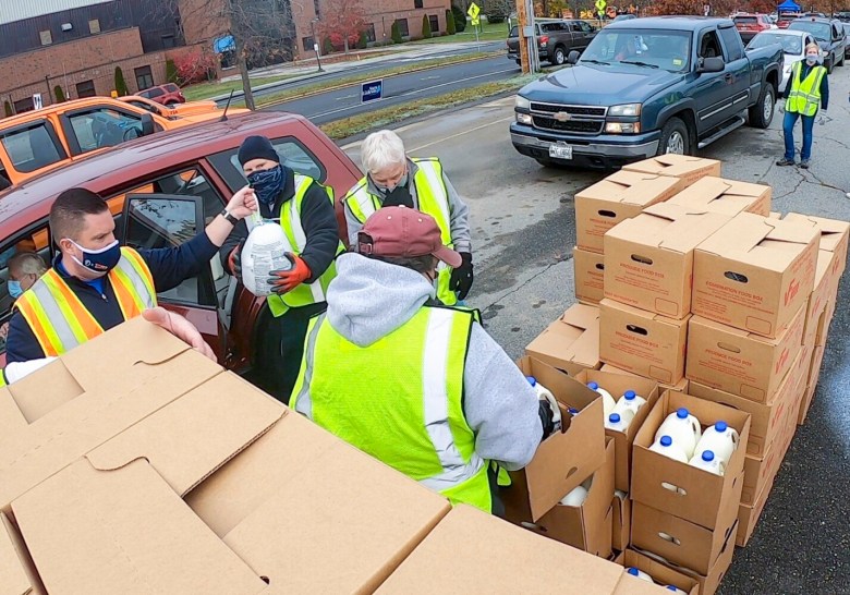 Volunteers handed out boxes containing meat, dairy products, fruits and vegetables and gallons of milk and frozen turkeys. All told, 2,300 gallons of milk and food boxes were distributed.