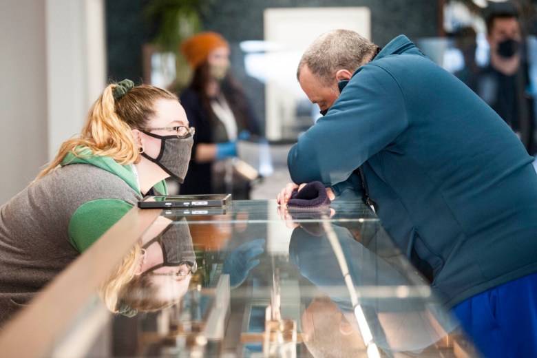 In the Waterville store Wednesday, customers perused the “bars” or glass cases containing product where they could see and smell different strains with names such as “Wedding Pie,” “Sun Cake,” “Purple Punch” and “Ice Cream Cake.”