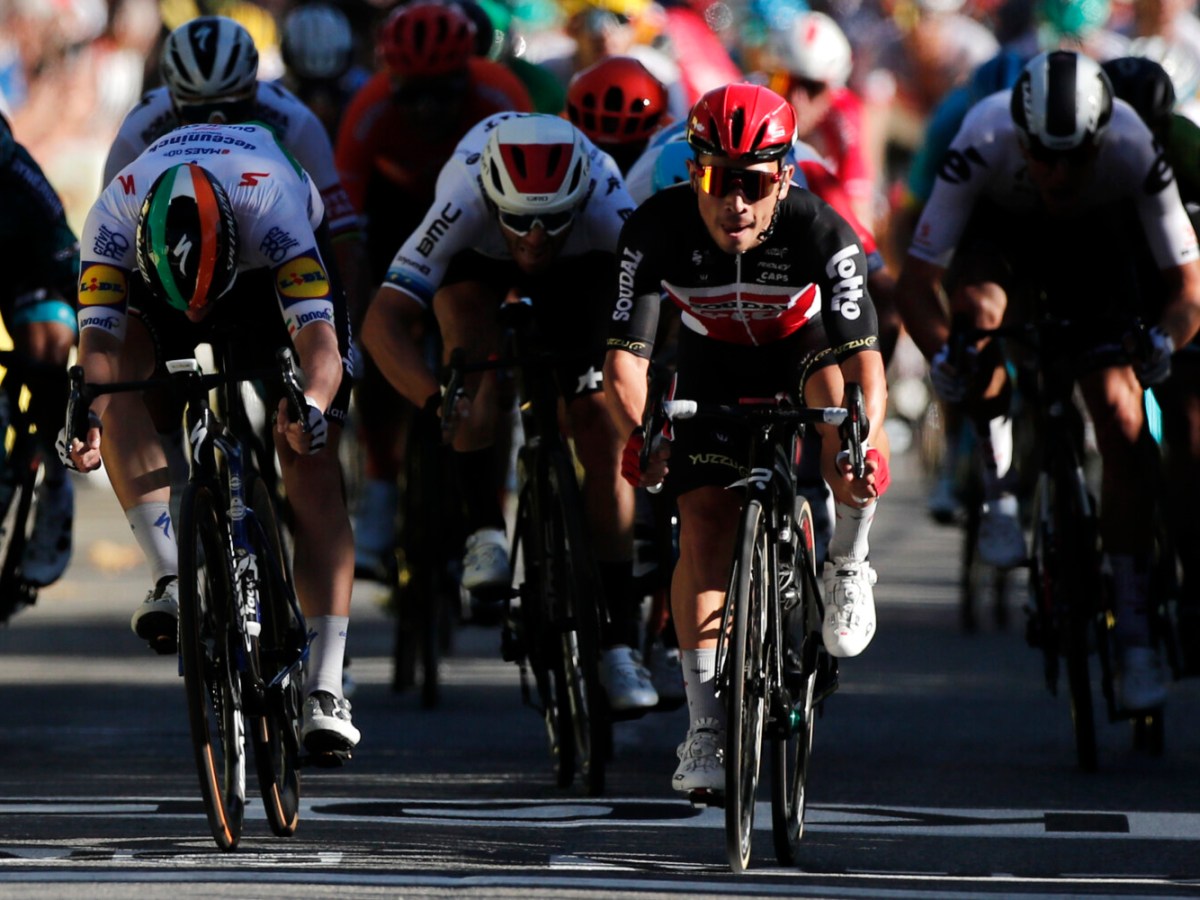Caleb Ewan waves through traffic to win the third stage of the Tour de France.