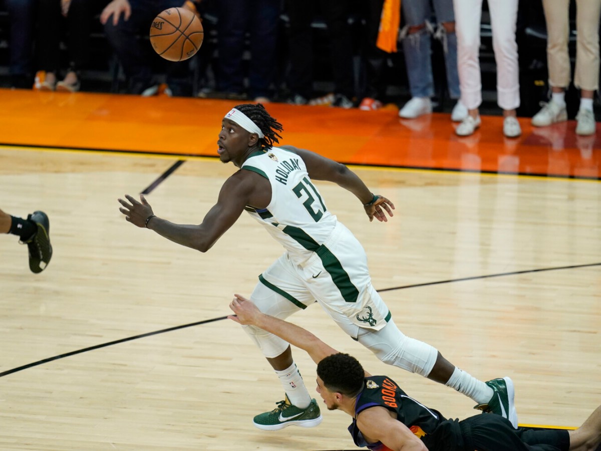 Jrue Holiday made a big defensive play late to help Milwaukee win its third straight game in the NBA finals.