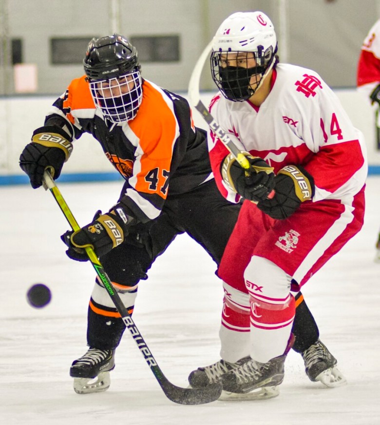 Cony/Hall-Dale/Monmouth/Erskine’s Joe Poulin, left, and Gardiner’s Darien Jamison go after the puck during a game Thursday at the Ice Vault in Hallowell. Joe Phelan/Kennebec Journal Buy this Photo
