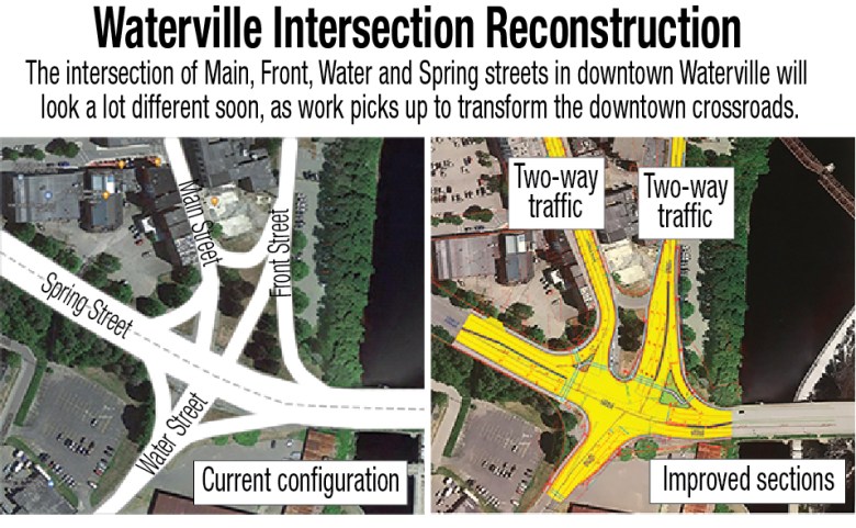 Crooker Construction Inc. of Topsham started working on the intersection March 21 as part of an $11.2 million project to transform Main and Front streets downtown to two-way traffic flow, improve intersections and sidewalks, and beautify the area with landscaping.