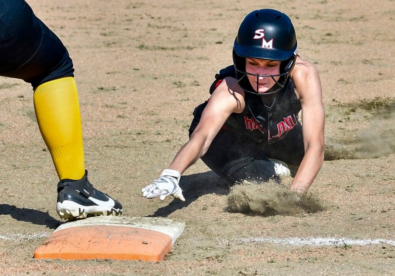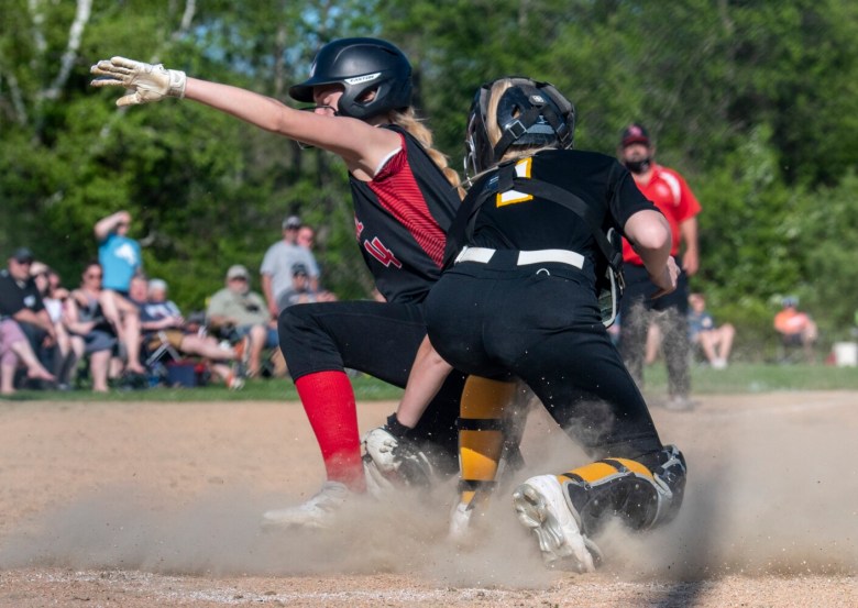 Hall-Dale’s Lily Platt slides safely into home as Maranacook catcher Alissa Michaud covers the plate Wednesday in Readfield. Joe Phelan/Kennebec Journal Buy this Photo