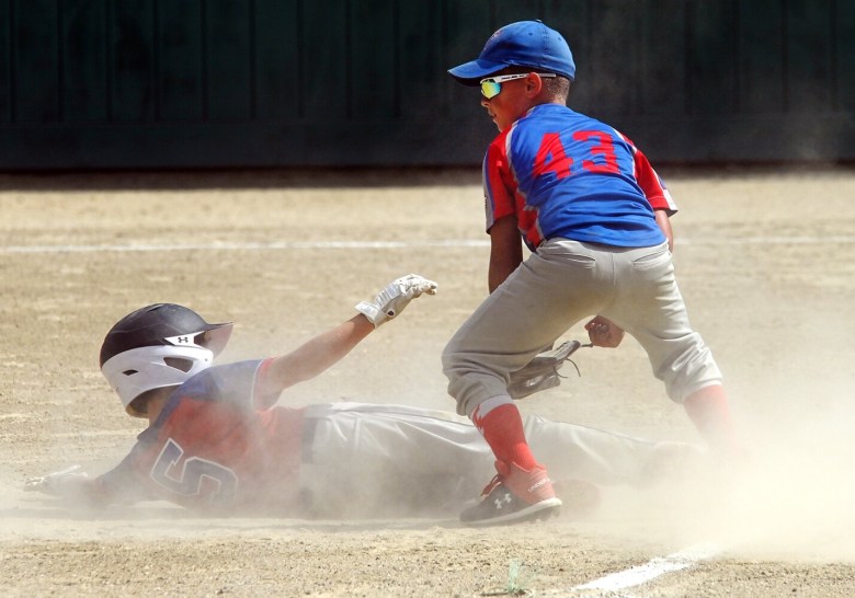 Ararat baserunner Michael Gardner is out at third base as Messalonskee’s Chase Dempsey receives the throw during a 10U state tournament game Monday at the Recreation Center in Sidney. Rich Abrahamson/Morning Sentinel