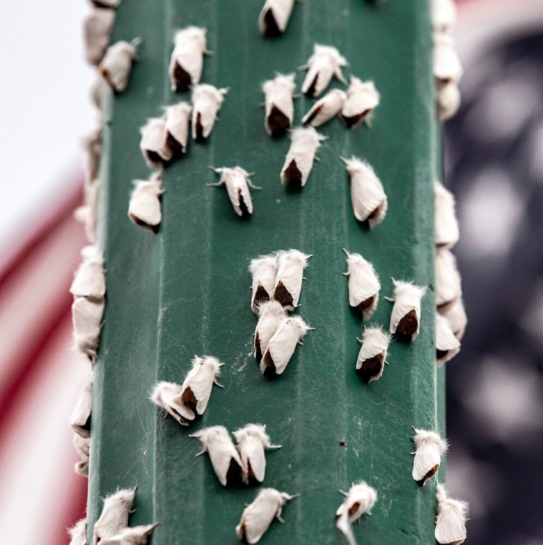 When she went to work Saturday, the parking lot was covered with moths that had been hosed off the building.