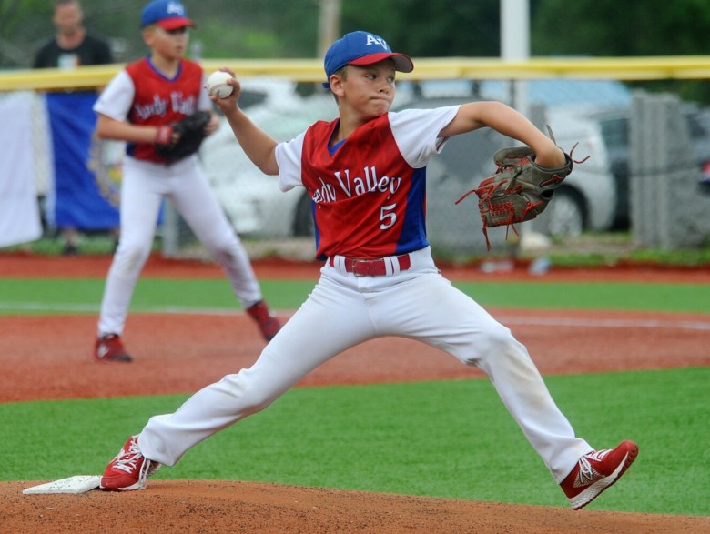 14875# 01baseball WATERVILLE, MAINE JULY 19, 2021. Waterville pitcher Sorrel Vinci (cq) challenges a Seacoast, New Hampshire hitter during the Cal Ripken 11U New England regional baseball tournament at Little Wrigley Field in Waterville, Maine Monday July 19, 2021.(Rich Abrahamson/Morning Sentinel)