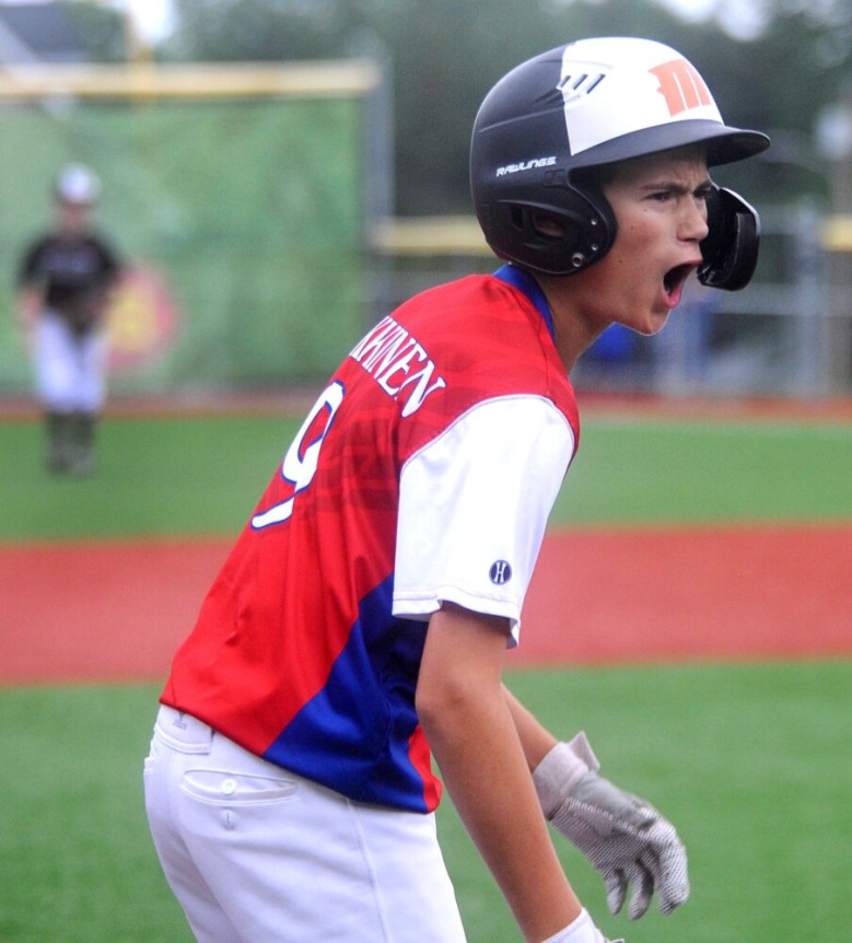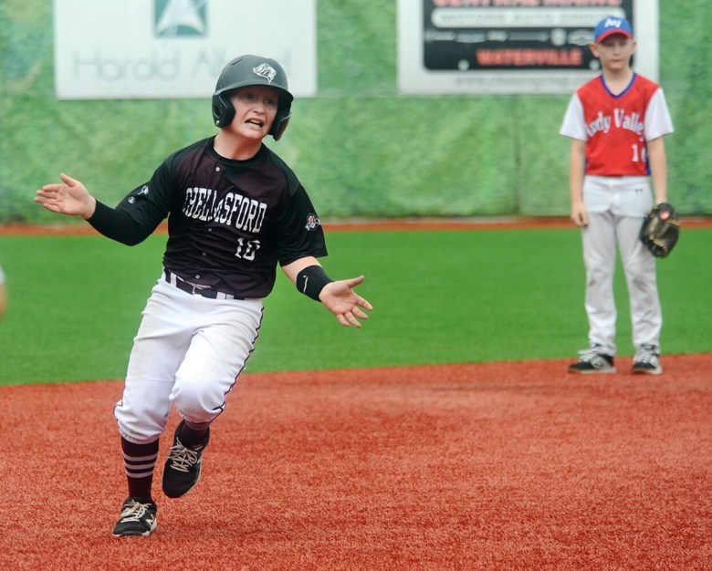 Andy Valley baserunner Rowen Pulkkinen celebrates after hitting a triple against Chelmsford, Massachusetts during an 11U Cal Ripken New England regional tournament game Monday afternoon at Little Wrigley Field in Waterville.